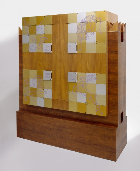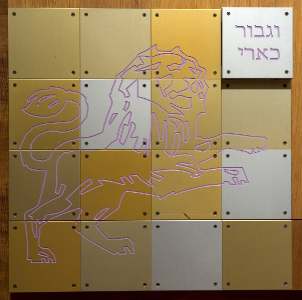 The face is divided into a grid of one hundred squares and the sixteen squares in each corner are inset with anodized aluminium plates, the gold and silver tones of which reference the precious metals ordained for the construction of the Ark of the Covenant. Each set of sixteen tiles has a paint filled linear engraving derived from, Ethics of the Fathers (Pirke Avot) 5,31: Strong as a leopard, swift as an eagle, fleet as a deer, heroic as a lion.