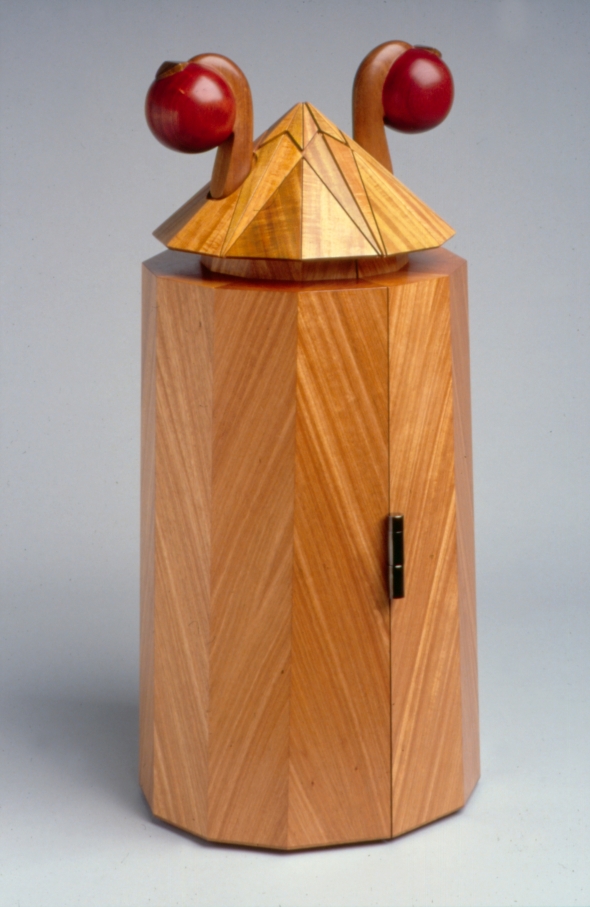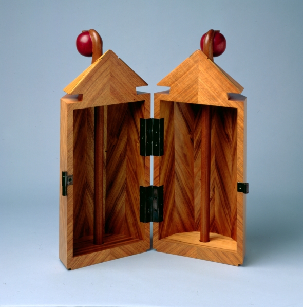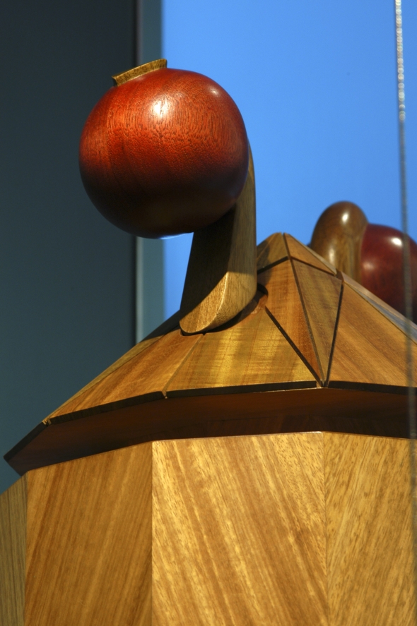 The Tiq was made with Queensland Blackwood on the outside and Tasmanian Blackwood on the inside, an Australian timber of the Acacia family as prescribed for the Ark of the Covenant. The trunk of the tree has twelve facets with the grain presented in a herringbone pattern. The twelve sides represent the twelve tribes described in scripture and the canopy is realized as a cone with leaves abstracted into a triangulation that presents as a series of concentric Stars of David in plan. The patterns therefore pick up on and represent some of the secondary symbols in Jewish iconography. The hinges and the locking catch were designed and fabricated in brass and finished in black chrome.