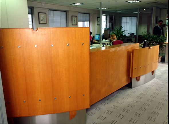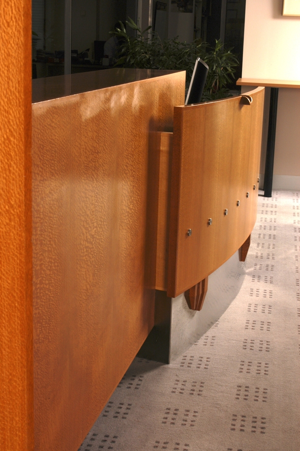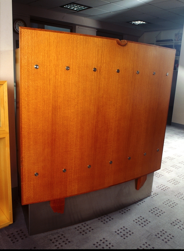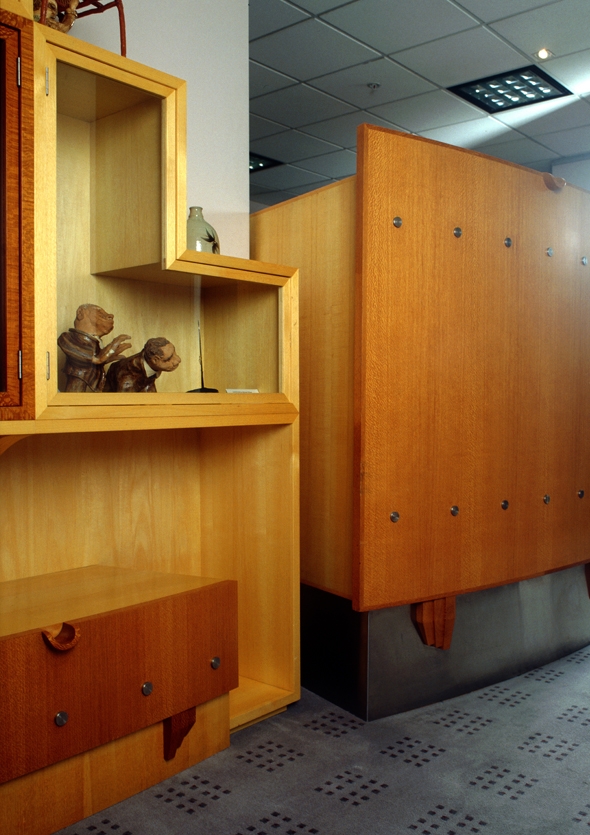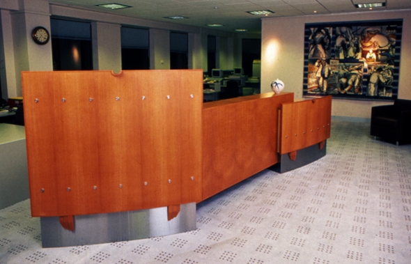 These desks include functionally integrated work stations, including all aspects of contemporary office technology, as well as working within an elaborate narrative. The section immediately facing the visitor combines the complementary images of a barrier (protective