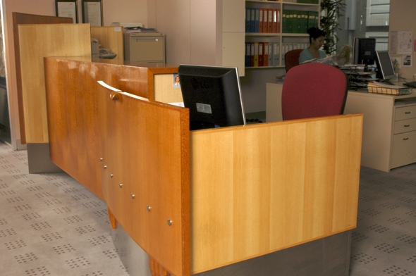 The second desk has the corral facing the waiting area but the visitor moves along the horizontal from an entrance door by the stern. The counter butts the wall by the entrance.