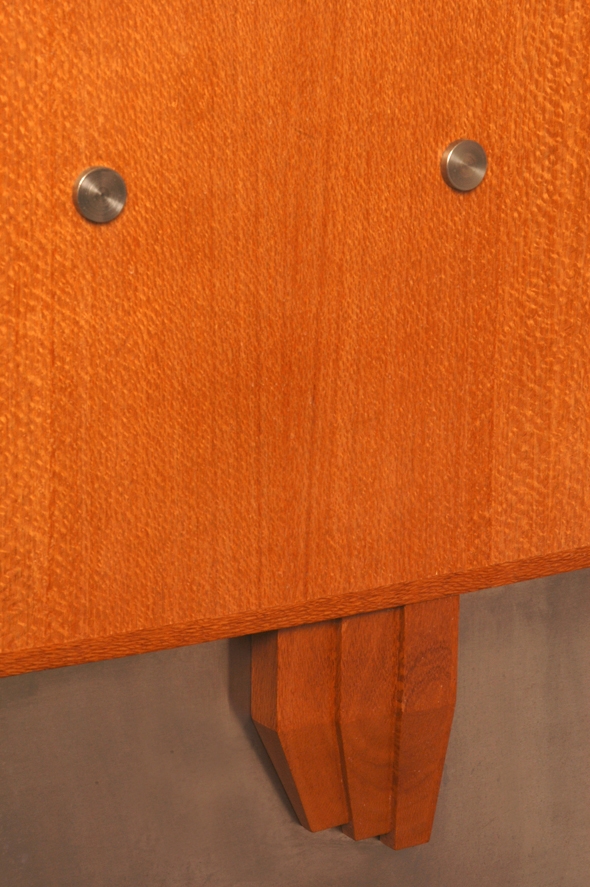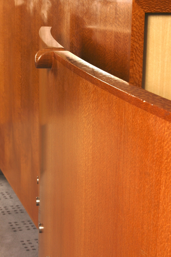Silky oak, silky oak veneer, silver ash, silver ash veneer, stainless steel, Duraloid work surfaces.