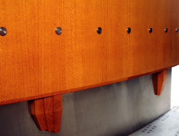 The image of the leading corral (Desk 1) therefore has three manifestations that of welcome, that of protection and that of attack. The potential, and the promise, is of all three a warning or a comfort depending on who is involved and with what issue. The lines of the desk (Desk 1) recede into the space, as with a forced perspective stage set, stepping the viewer/visitor into the space. Reception is still the principal function. The visitor is drawn to the long counter-like centre section from which point the people at any of the three work stations in the desk can be engaged with. The smaller, distant corral, turned back to face the visitor in part echo of the leading corral is lower, softer and as the third and lowest element, draws the eye into the space. It also visually anchors the far end of the floating horizontal.