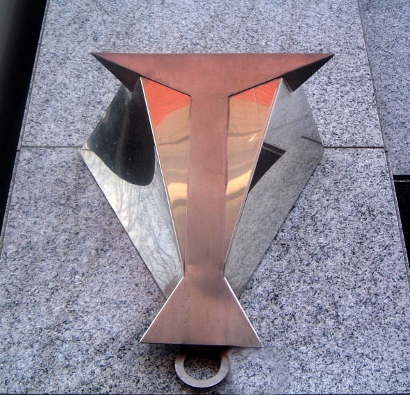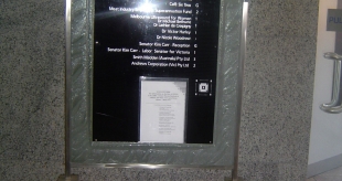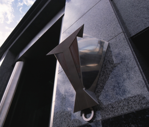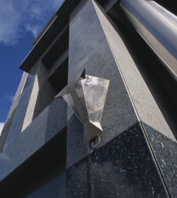 Frontage lights manifesting as stylized stainless steel bulls heads flank the entrance way. Evoking gargoyles they also reference the traditional symbols of animal husbandry, the cast iron animal heads flanking the interior wholesale bays in the Victorian era North Melbourne Meat Market building (later the Meat Market Craft Centre) and the rendered low relief animal forms in the facade of the Victoria Market, both in Melbourne. They are a mannered reference to the AMIEU and celebrate the type of representational iconography that occurs throughout the history of the development of medieval guilds into contemporary unions. Light is thrown up and down, rather than forward, which illuminates the granite with a backwash of light, highlighting the form physically and metaphorically showing the way