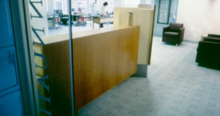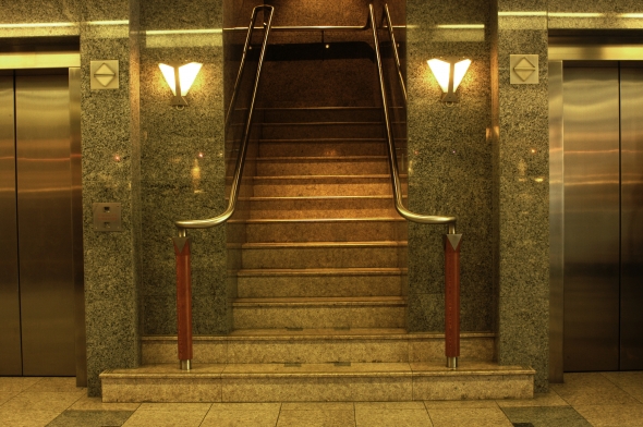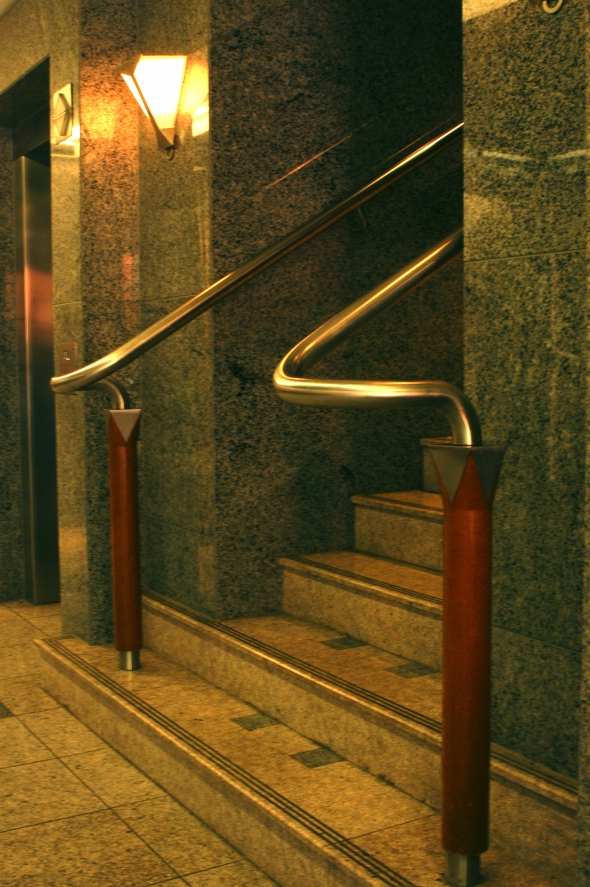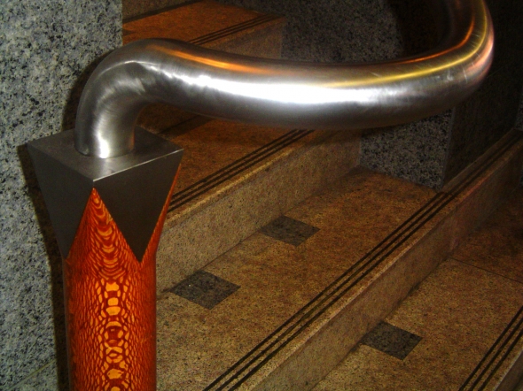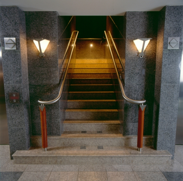 Bulls-head wall lights, similar to those on the building facade, are repeated on a smaller scale inside the foyer, flanking the showcases and the staircase. The three main faces of the form are realized in opaque, white glass, allowing light to be thrown forward. The interior program extends to the Queensland Silky Oak newel posts, inserting slivers of warmth into the steel and stone interior, repeated in the posts supporting the slumped glass directory.