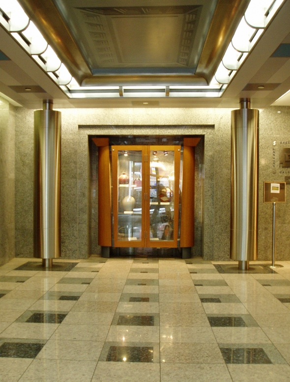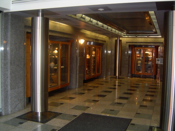 From the main entrance showing the granite floor design and The Whole Truth display cabinets in niches.