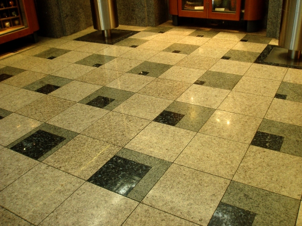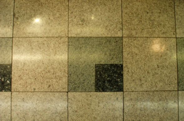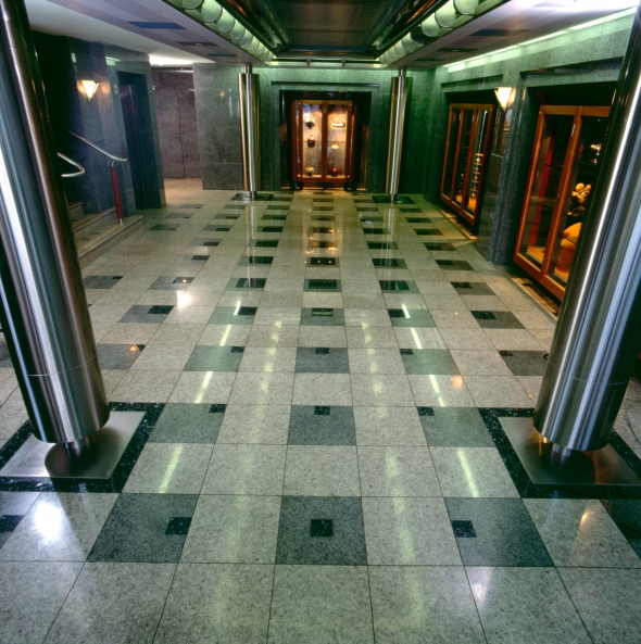 The expanding grid on which the granite floor is constructed, designed in collaboration with Bruce Edwards, a colleague. In the centre of the floor the small, darker, square inserts, which sit elsewhere in the application of this grid in the inner corners of the four-squares, are enlarged. As the grid moves to the edges of the space they gradually diminish. The effect is to draw the eye from the richly embellished and furnished edges of the space in to the centre.
