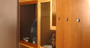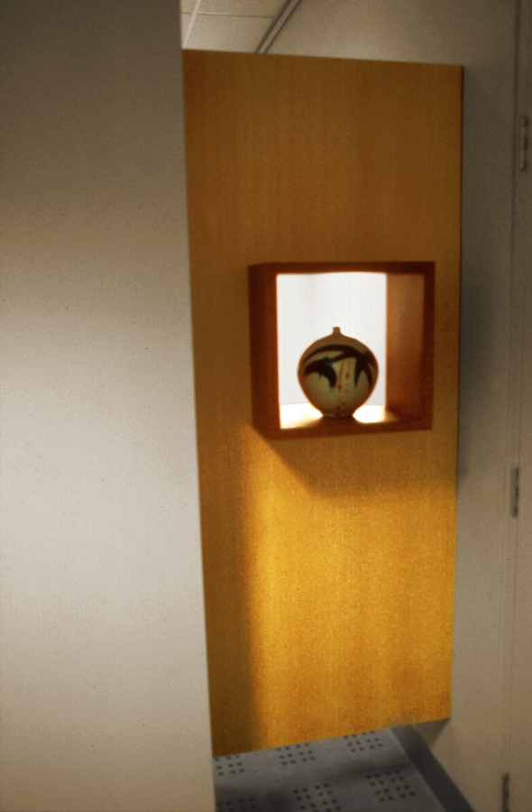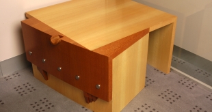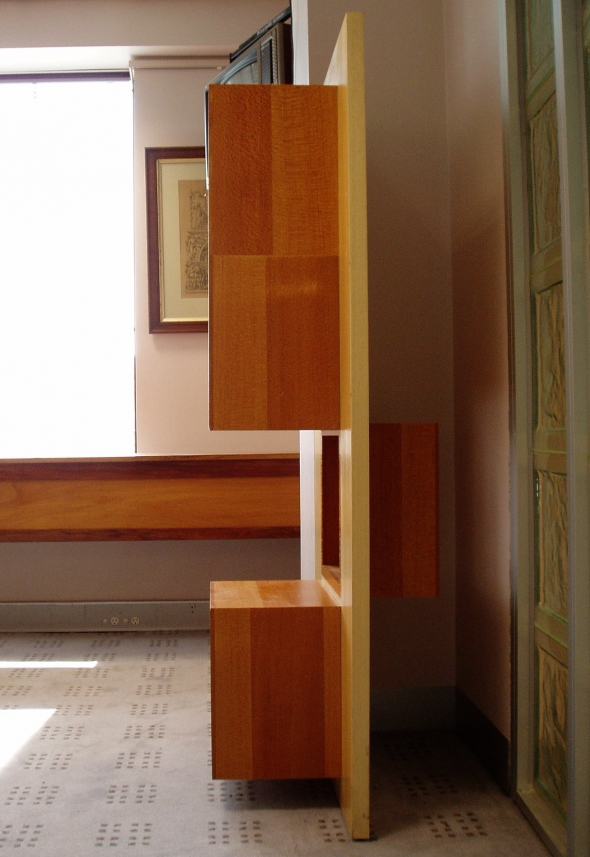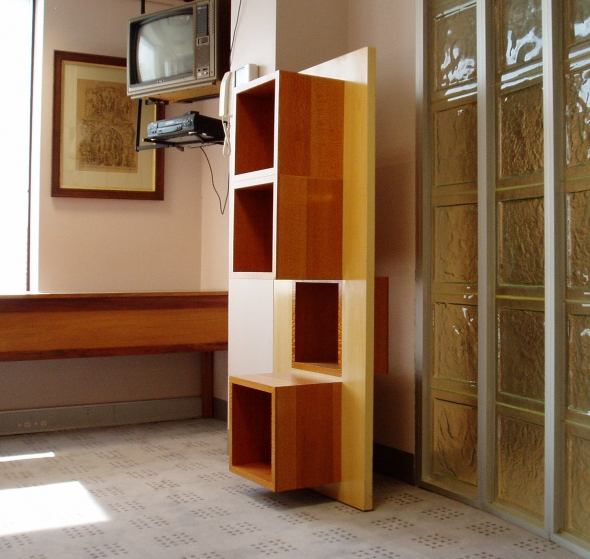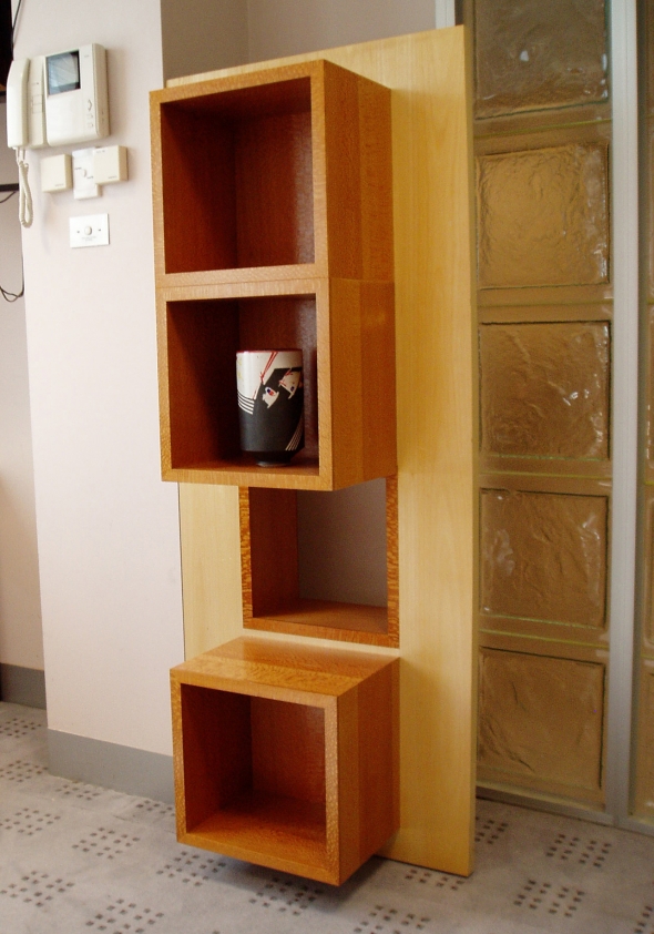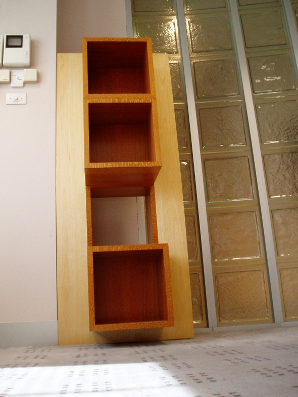 The title Modest Truth puns on the truth to purpose ideology that celebrates a reductive aesthetic which most of Lueckenhausns work eschews. A Queensland Silver Ash vertical panel, spanning a gap between a clumn and a wall, supports four Queensland Silky Oak cubes arranged vertically with the top and two bottom cubes extending into the room and the second cube from the top extending towards the doorway. The latter cube opens through the vertical panel providing a window and the capacity to view the object displayed from both sides. The cubes protruding to either side build on an inside/outside, either side of a barrier, image with the peek window offering a glimpse of what is otherwise hidden.