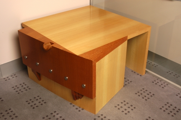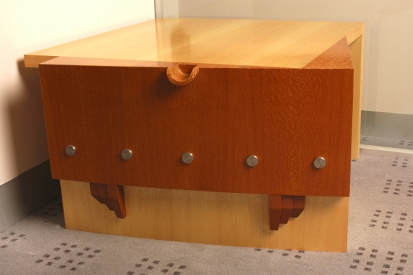 The Nigel and Rupert Help Too tables involve three, finely articulated, intersecting forms with the Zoomorphic, Silky Oak element intersecting with the Silver Ash table as well as being perched, Teraph like, on its Silver Ash podium. The curved Zoomorphic form is offset for increased tension and animation reminiscent of a dog turning its attention to one side.
