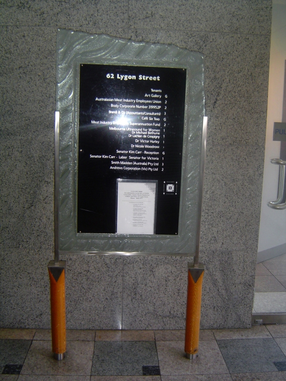 Bulls-head wall lights, similar to those on the building facade, are repeated on a smaller scale inside the foyer, flanking the showcases and the staircase. The three main faces of the form are realized in opaque, white glass, allowing light to be thrown forward. The interior program extends to the Queensland Silky Oak newel posts, inserting slivers of warmth into the steel and stone interior, repeated in the posts supporting the slumped glass directory.