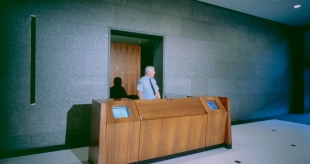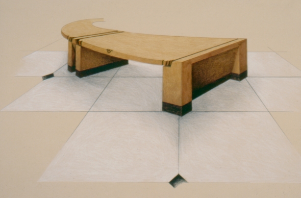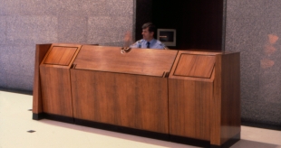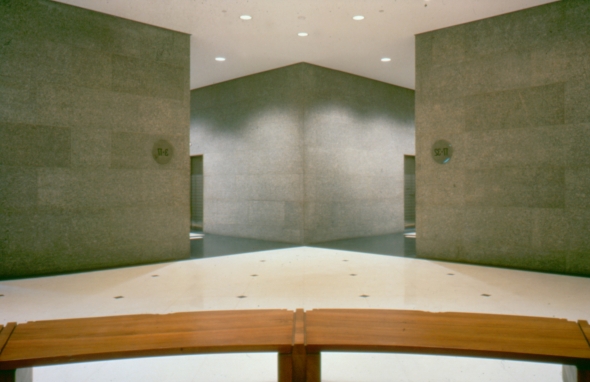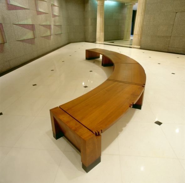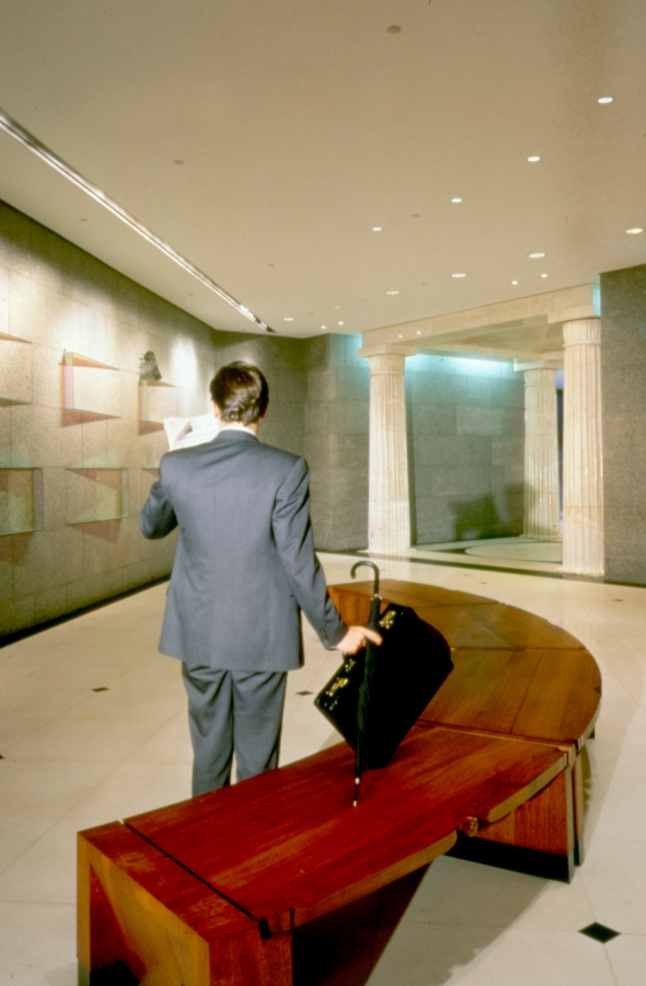 The first refurbishment of Collins place saw the arch-modernist architectural firm of I M Pei install a series of post-modern affectations such as carved marble columns based on draped fabric. None the less, the plan maintained classic modern sight lines, which controlled the placement of furniture items and which called for a seating bench to be designed on a prescribed arch. In the seating bench, the desks and the static directory, certain of Lueckenhausens signature zoomorphic elements, such as the lip and foot details were abstracted by him to bridge the gap between his personal iconography, and the architects desire for understatement.
