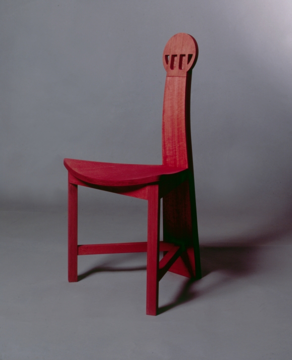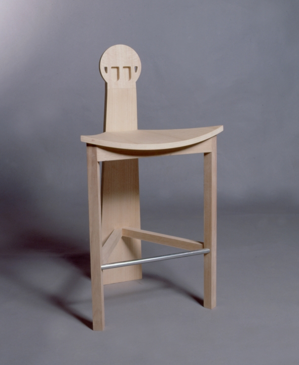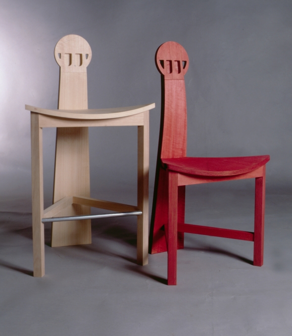 The brief from the project architect was to create a solid craft-based chair and bar-stool with flora iconography at a commercial furniture price point, to be manufactured in Australia, in Australian timber. In the event, Lueckenhausen designed an abstracted tree trunk and canopy motif for the chair back and by cutting a standard bent ply form at an acute angle, created the illusion of a complex bend. The ergonomics were based on the Dreyfus specifications, resulting in a level of comfort that surprised patrons probably because of the lines of the chairs, and the un-upholstered seats. The chairs were manufactured by James Bradley in Launceston, Tasmania.