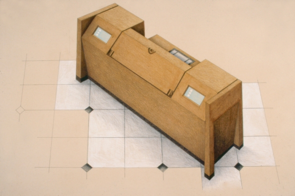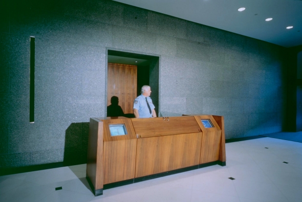 The first refurbishment of Collins place saw the arch-modernist architectural firm of I M Pei install a series of post-modern affectations such as carved marble columns based on draped fabric. None the less, the plan maintained classic modern sight lines, which controlled the placement of furniture items and which called for a seating bench to be designed on a prescribed arch. In the seating bench, the desks and the static directory, certain of Lueckenhausens signature zoomorphic elements, such as the lip and foot details were abstracted by him to bridge the gap between his personal iconography, and the architects desire for understatement.