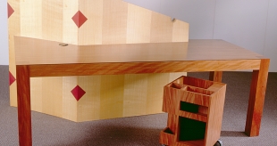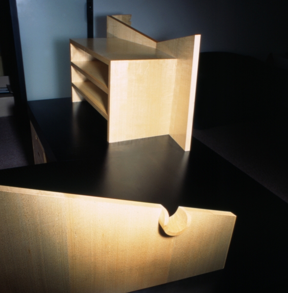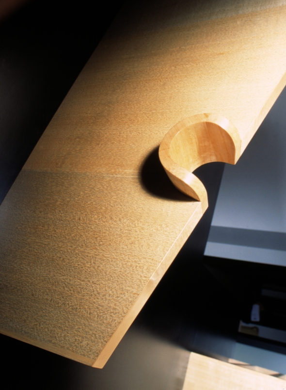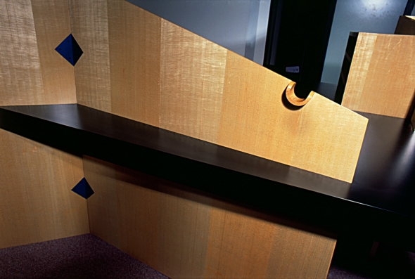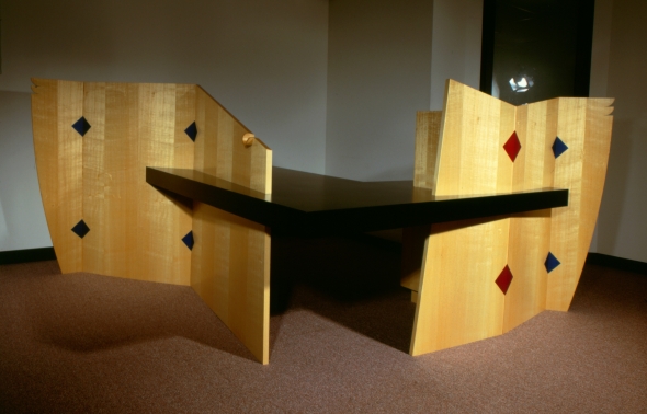 The primary device in this work is a system of two, three-leaved Queensland Silver Ash screens with expressed, anodized blue and red aluminium joining plates. Each set presents on three planes with an undulating upper horizon. Five screens are flat and one is curved with the two outer screens manifesting with a curved end line diminishing to the bottom and with a heavily stylized suggestion of wings at the upper corners. One of Lueckenhausen’s core leitmotifs, a Zoomorphic form originally adapted from a Jacaranda seedpod but which later developed into a lip form sits at the top of one of the inner screens and joins the wings in making an understated reference to Zoomorphic movement, presence, and importantly, personality. In Heimdall Stage 1, which utilied both sets of screens, the work surface intersects them, a floating black top suggesting an infinite plane.