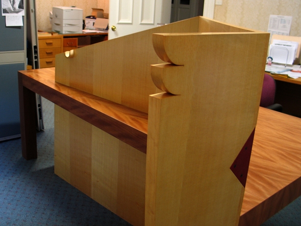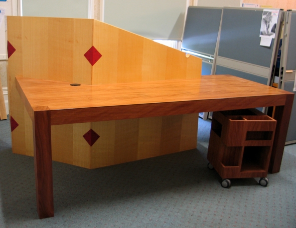 The Heimdall: Stage 2, desks incorporate the screens from both ends of Stage 1, with the addition of a Zoomorphic lip form into the side where there was not one before. Stage 2, Desk, 1 also utilises the drawer unit and paper shelves from the original configuration.
