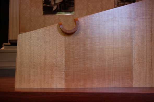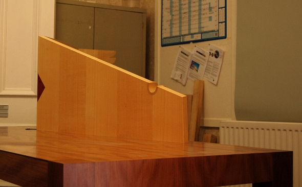 The primary device in this work is a system of two, three-leaved Queensland Silver Ash screens with expressed, anodized blue and red aluminium joining plates. Each set presents on three planes with an undulating upper horizon. Five screens are flat and one is curved with the two outer screens manifesting with a curved end line diminishing to the bottom and with a heavily stylized suggestion of wings at the upper corners. One of Lueckenhausen’s core leitmotifs, a Zoomorphic form originally adapted from a Jacaranda seedpod but which later developed into a lip form sits at the top of one of the inner screens and joins the wings in making an understated reference to Zoomorphic movement, presence, and importantly, personality. In Heimdall Stage 1, which utilied both sets of screens, the work surface intersects them, a floating black top suggesting an infinite plane.
