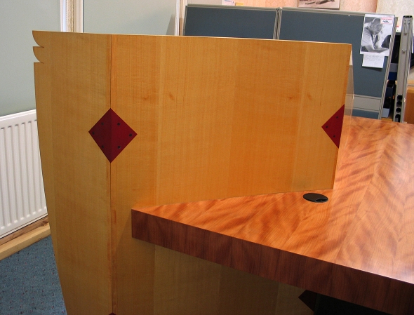 Reception desks, silver ash, silver ash veneer, solid core laminate, anodized aluminium.