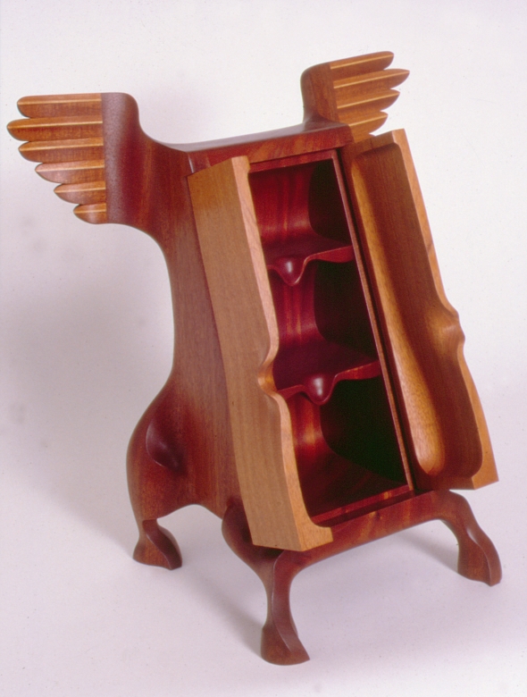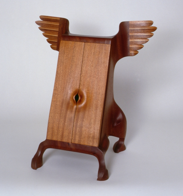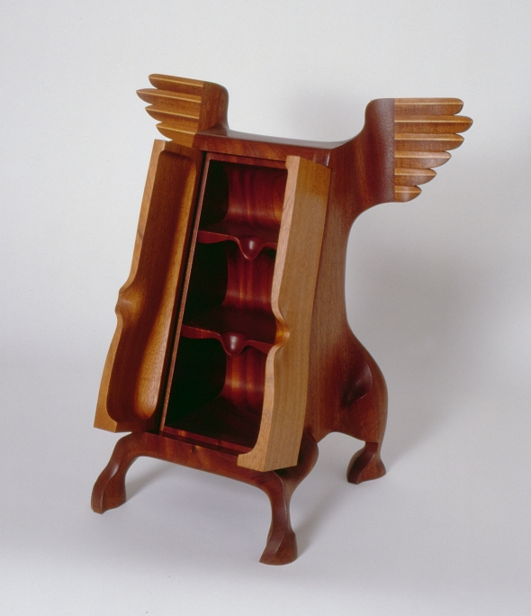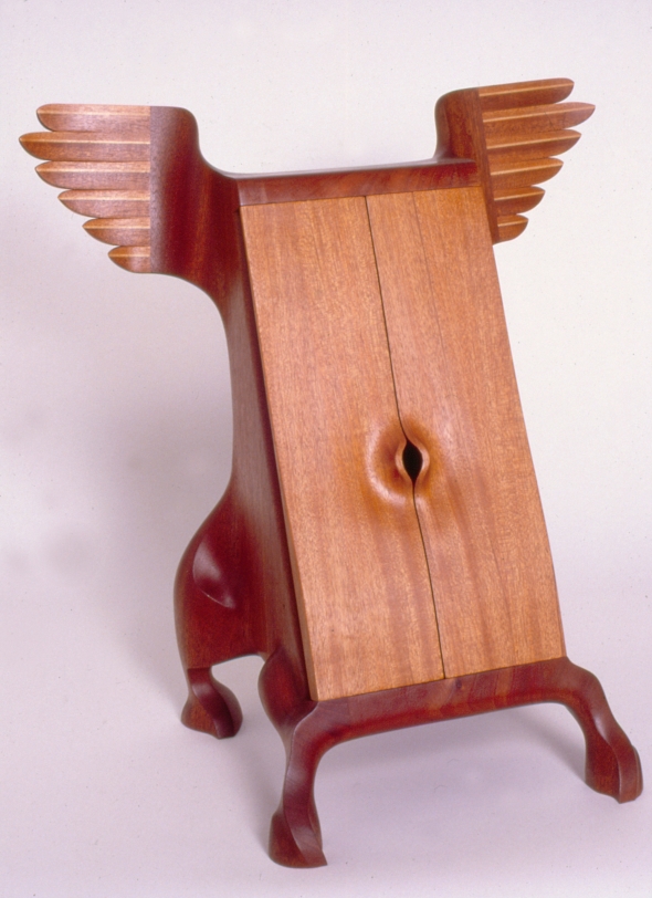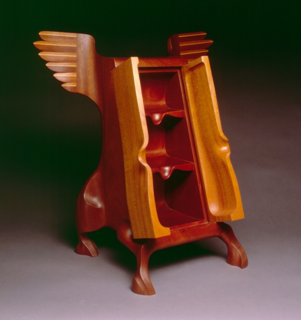 Lueckenhausen’s earlier studio furniture works grew out of a comprehensive study of seed pods, and other aspects of the regenerative parts of flora and evolved into a variety of container-based forms – bowls, boxes, trinket boxes, etc. These forms also evolved further through continual stylisation into a series of functional surfaces, small tables, benches, lecterns and music stands. A series of waist-high ceremonial bowls, most often made during residencies at universities and colleges extended this theme. Still later, they evolved into larger tables and full dining settings in which the chairs and tables present as a sort of family group. The Jacaranda seedpod, the lip-like opening of which evolved through a continual series of mutations into one of Lueckenhausen’s key signature marks is often seen as a visual resolution point or as a functional handle. The flared sides of the pod led to a series of works with flared edges and eventually, as the works crossed from flora to fauna references, into wings and related elements that have developed into a sort of mythological iconography. The lip form continued to evolve into an even more mannered zoomorphic reference. Whether plant or animal-like, or a combination of both, they work within a narrative that ranges from the semi-heroic to the humorous, and even to a sort of self-deprecating mockery. The imagery ranges from elegance and gracefulness, to that of ‘minor’ characters acting out a story in a kind of domestic diorama. Tables, and chairs in particular, referenced the proportions suggested in the Dreyfus charts for designing to suit human proportions, and no matter how decorative or theatrical the forms became, they were always designed in appropriately ergonomic proportions.