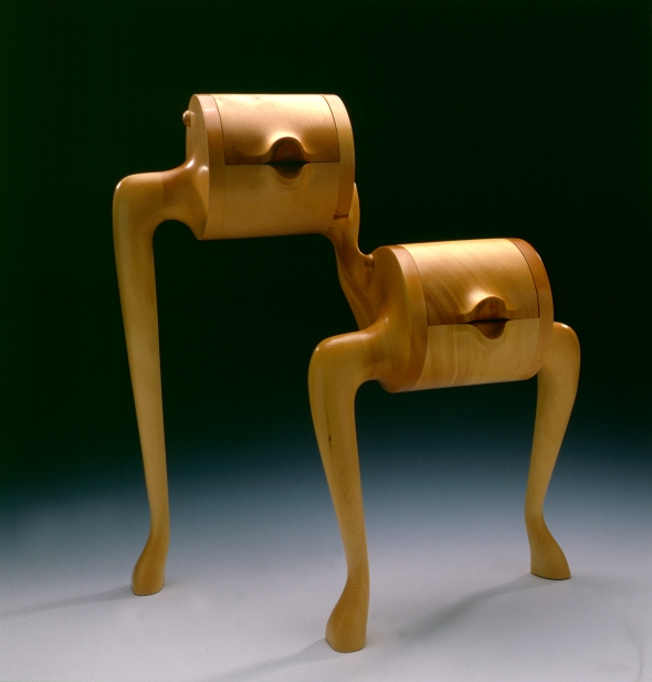 Lueckenhausens earlier studio furniture works grew out of a comprehensive study of seed pods, and other aspects of the regenerative parts of flora and evolved into a variety of container-based forms bowls, boxes, trinket boxes, etc. These forms also evolved further through continual stylisation into a series of functional surfaces, small tables, benches, lecterns and music stands. A series of waist-high ceremonial bowls, most often made during residencies at universities and colleges extended this theme. Still later, they evolved into larger tables and full dining settings in which the chairs and tables present as a sort of family group. The Jacaranda seedpod, the lip-like opening of which evolved through a continual series of mutations into one of Lueckenhausen's key signature marks is often seen as a visual resolution point or as a functional handle. The flared sides of the pod led to a series of works with flared edges and eventually, as the works crossed from flora to fauna references, into wings and related elements that have developed into a sort of mythological iconography. The lip form continued to evolve into an even more mannered zoomorphic reference. Whether plant or animal-like, or a combination of both, they work within a narrative that ranges from the semi-heroic to the humorous, and even to a sort of self-deprecating mockery. The imagery ranges from elegance and gracefulness, to that of minor characters acting out a story in a kind of domestic diorama. Tables, and chairs in particular, referenced the proportions suggested in the Dreyfus charts for designing to suit human proportions, and no matter how decorative or theatrical the forms became, they were always designed in appropriately ergonomic proportions.